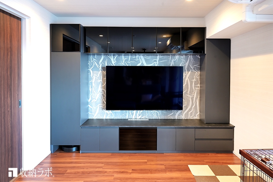 1mm単位でサイズ調整が可能なオーダー家具だから、収納するものに合わせて最適な収納を作ることができます。家族同然の愛犬とお客さまにとって、快適なマンションライフを叶えることができてました。