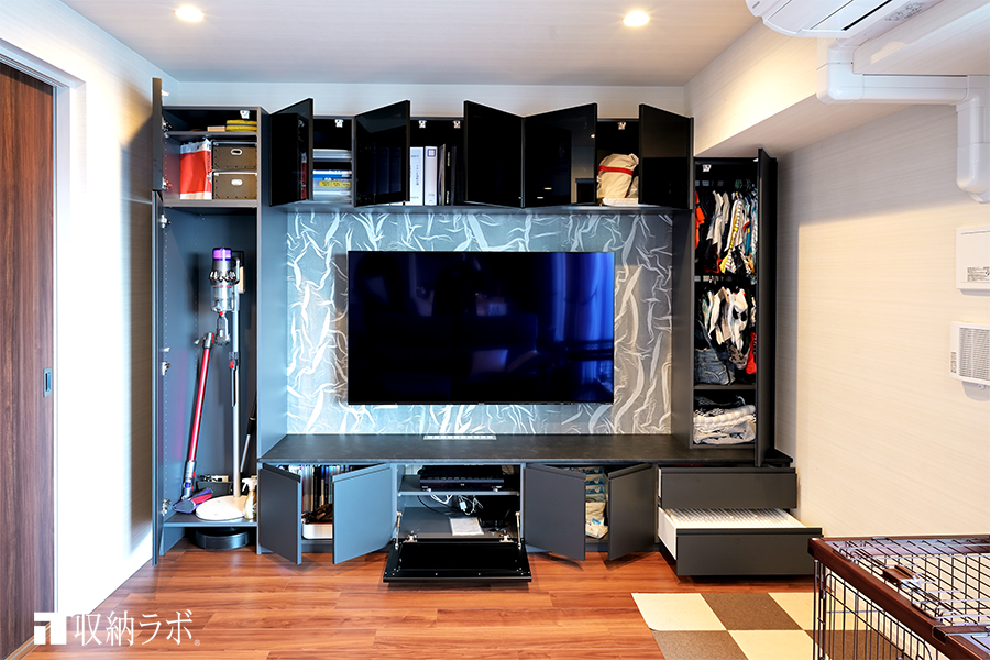 壁面収納の右側はペットコーナー、テレビの下にはオーディオ機器、左側は掃除道具コーナーといったように、壁面収納を用途別に収納を分類しています。