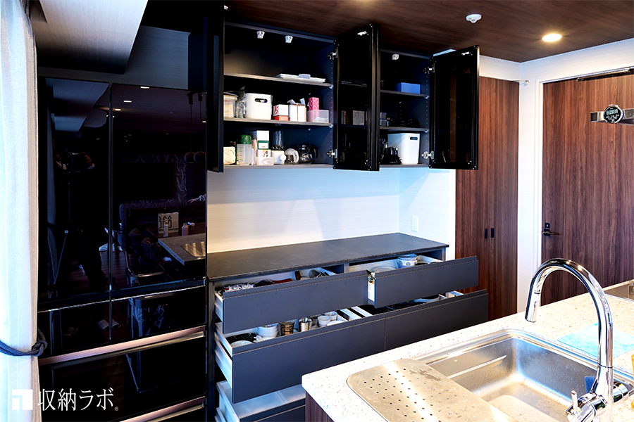 リビングの壁面収納と同様に、黒とグレーで統一されて落ち着いた雰囲気のキッチンに仕上がっています。吊り戸棚の扉は、黒のスモークガラスを採用して、中が見えないようなっているため、生活感を感じさせないデザインになっています。