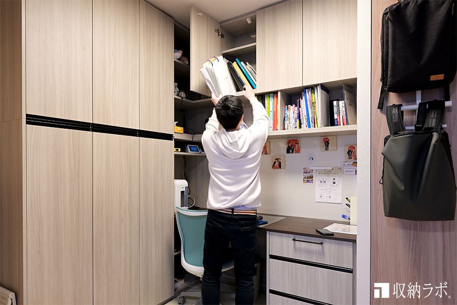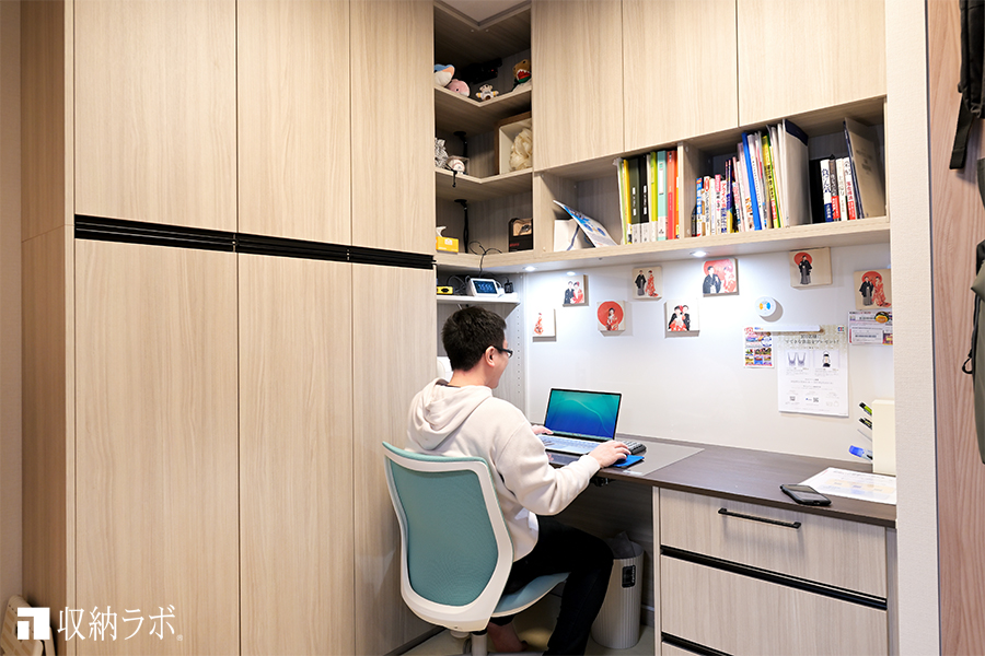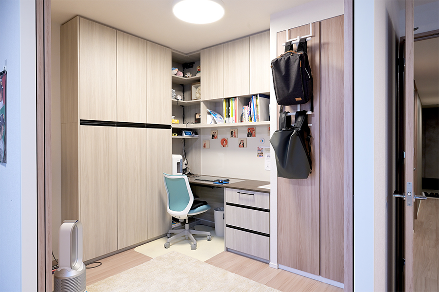 既存のクローゼットのサイズに合わせて、お部屋のコーナー部分にL字の収納を作ることで、2つの壁面を最大限に活用することが可能になります。今回のお客様からも「手の届く範囲に必要な収納が集約されているので、とても使いやすいデスクスペースになりました。コーディネーターの方に提案していただいたデザインや収納アイデアなども参考になりました」と満足されています。