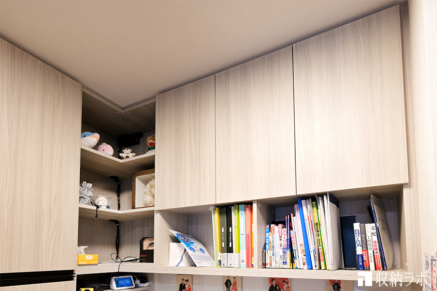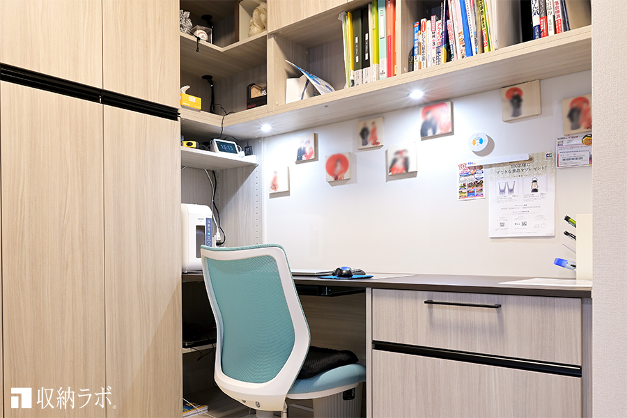 デスクスペースの上には本棚、サイドキャビネットを組み込み、実用的な空間づくりをしています。吊り戸棚の底面にはLEDライトを取り付けてあります。