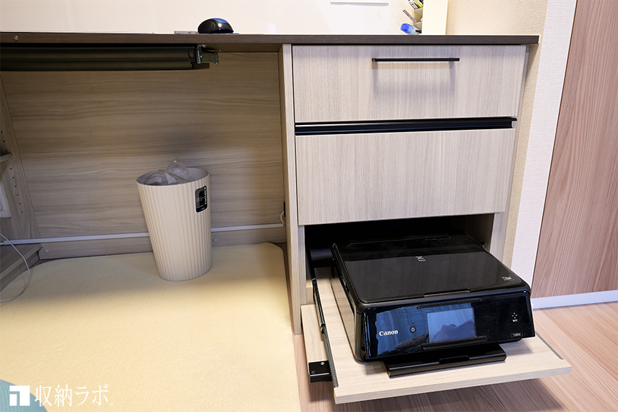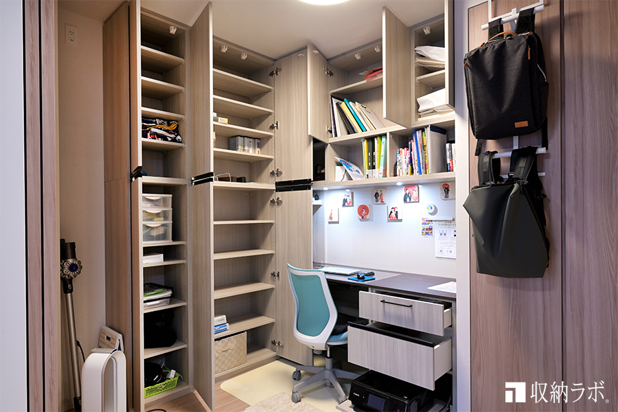 そこで、収納ラボのコーディネーターから、日用品・掃除機のための収納と、本棚、デスクが一体となったL字型の家具を提案させていただきました。