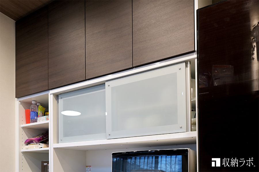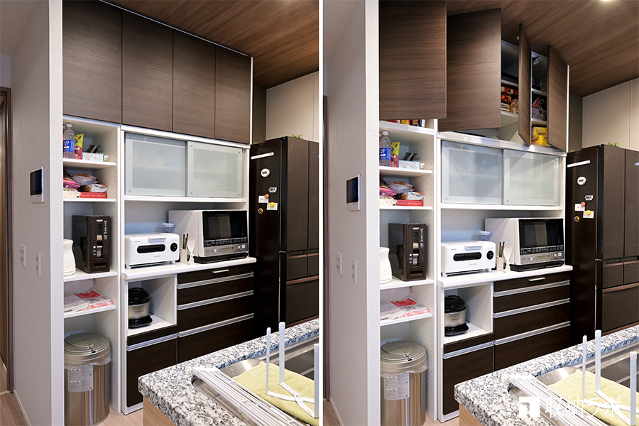 そこで、食器棚の上に吊戸棚、左側にオープンな収納棚を設置することを提案させていただきました。食器棚をすっぽりと囲むような設計になっています。