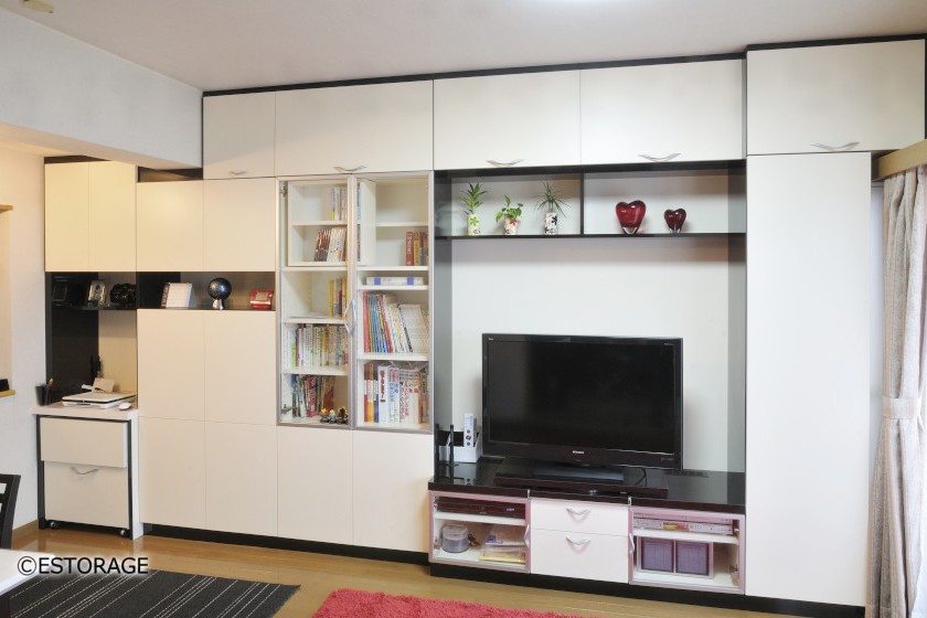 壁一面を収納棚にしてしまうのではなく、飾り棚やテレビ台を組み合わせることで圧迫感が減少します。
