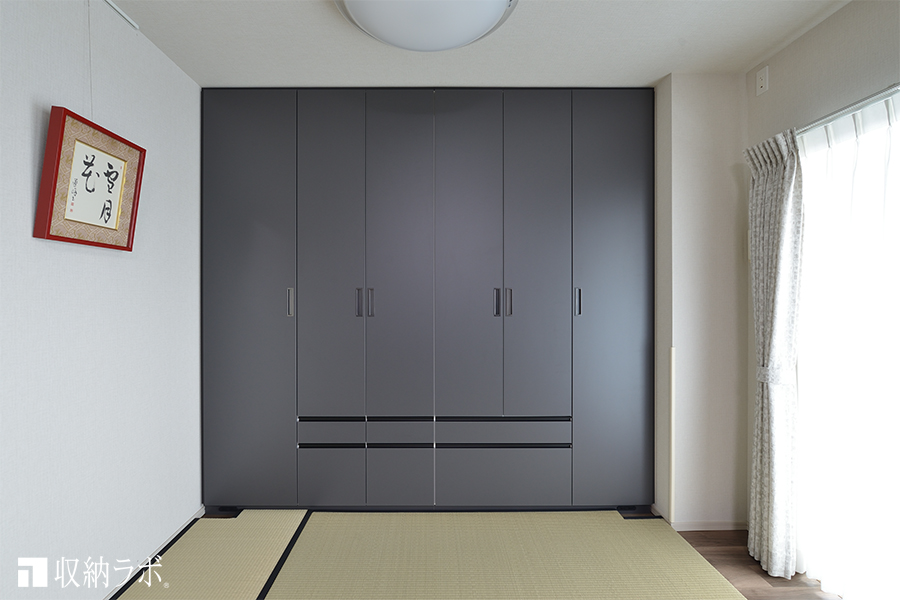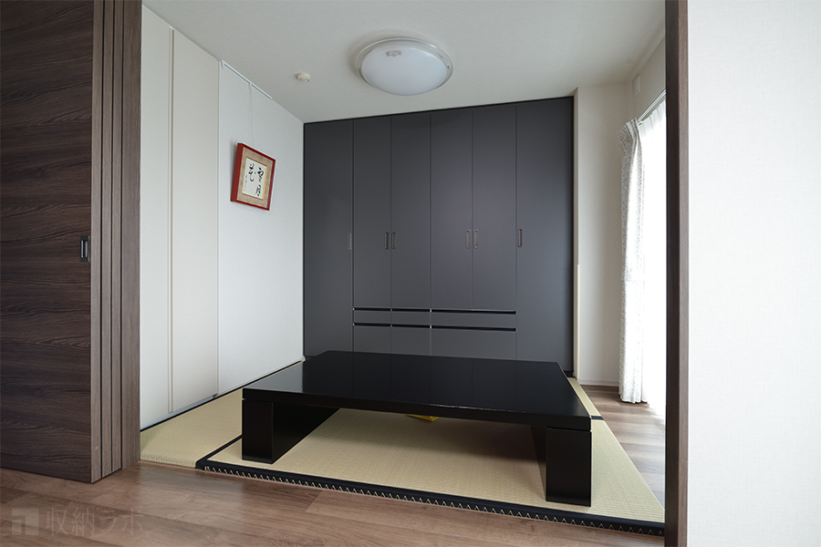 壁面収納の色味はダーク系で統一。上質で落ち着きのある雰囲気のデザインです。お客様ご自身で設置された畳と合わせて、和モダンにコーディネートされたお部屋は書道をする場にふさわしい空間となっています。