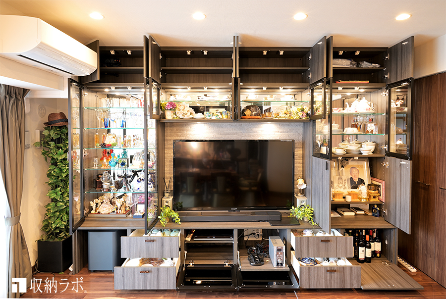 そうしたご要望を受けて、収納棚の背面に鏡、ガラスの棚板、そしてLED照明を取り入れ、大切なコレクションのディスプレイを楽しめるアイデアをカタチに。