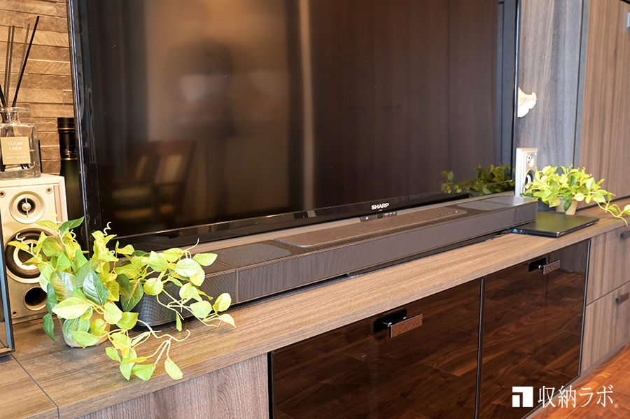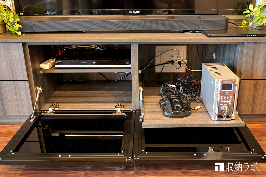 音響などのデジタル機器の配線が見えないよう、家具の中に配線を通しテレビ下のコンセントにコード類を集約。雑多な印象を与えてないようにしました。