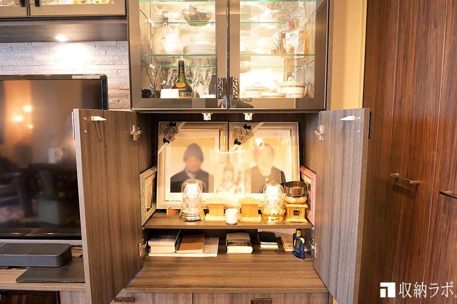 以前の住まいでは仏間に仏壇を置いてあったそうですが、現在はリビング収納の一角が仏壇です。