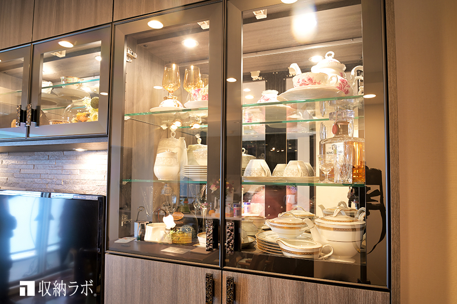 隠す収納によって、テレビ周りに飾られている食器類がが引き立つようになっています。