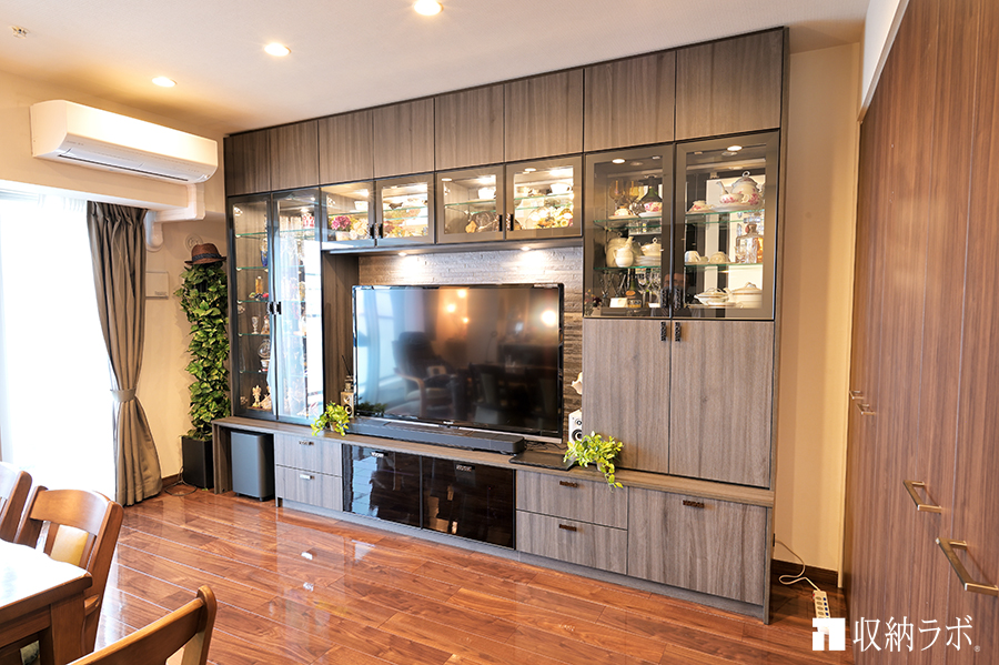 新居では、お気に入りの食器類をリビングに飾り、いつでも眺めていられる収納にしたいと要望がありました。