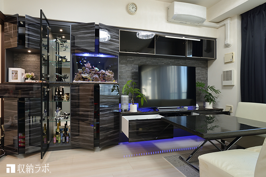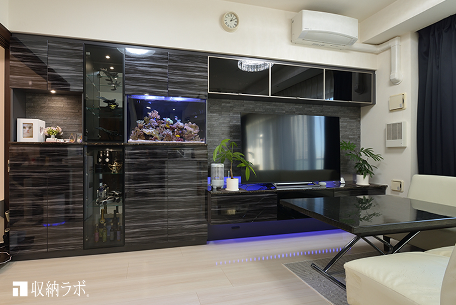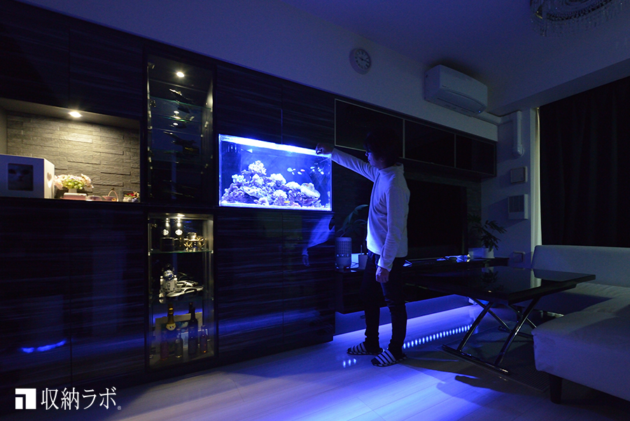 そして、リビングのインテリアを演出するアイテムとして熱帯魚が泳ぐ水槽を使い、ブルーのLED照明を組み込んだ壁面収納が完成。