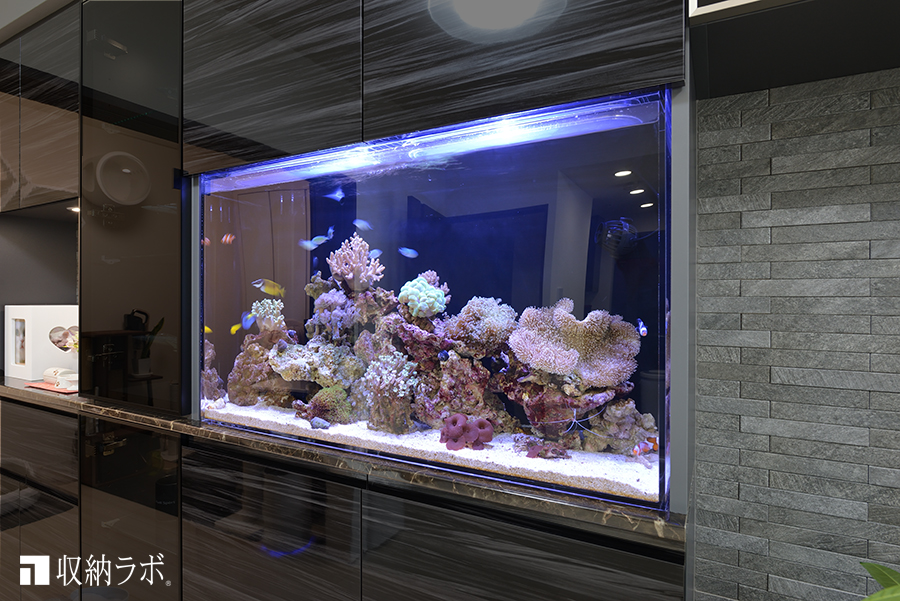 熱帯魚が泳ぐ水槽を組み込んだ壁面収納