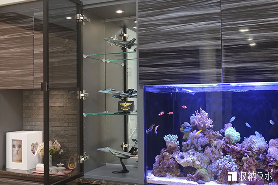 壁面収納には、水槽を中心にコレクションのディスプレイ用のガラス扉の飾り棚を設けています
