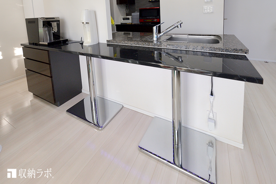 キッチン周りの空間演出にもこだわり、カフェスタイルのカウンターと収納をデザイン。