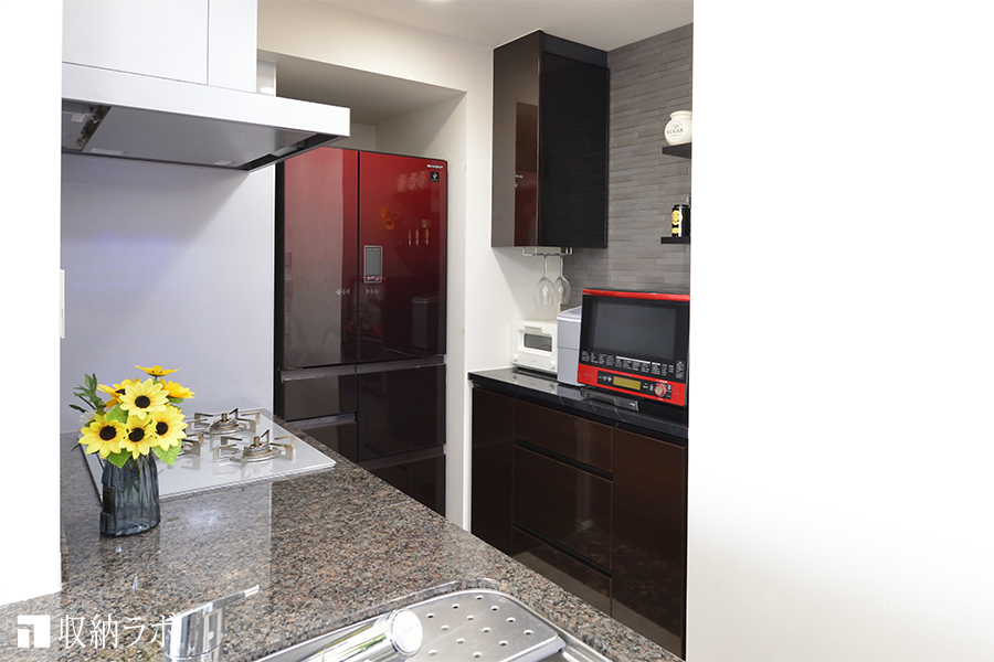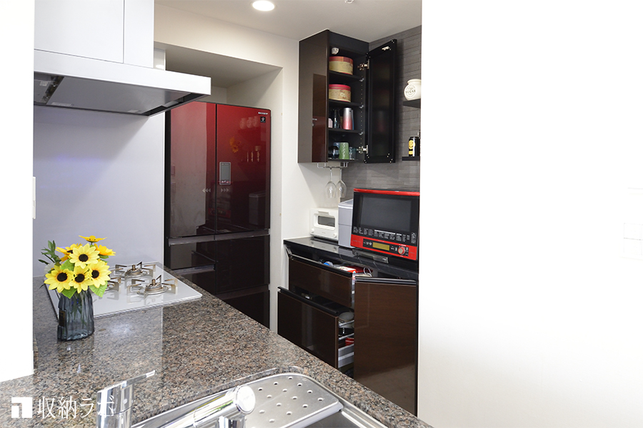 普通は、上下の収納は同じ向きに設置するのですが、今回は上部の吊り戸棚を90度向きが違う側面に設置することに。冷蔵庫を設置する向きに合わせることでものの出し入れはしやすく、正面から見た時には上部の壁面がオープンになることで、圧迫感を軽減することができました。