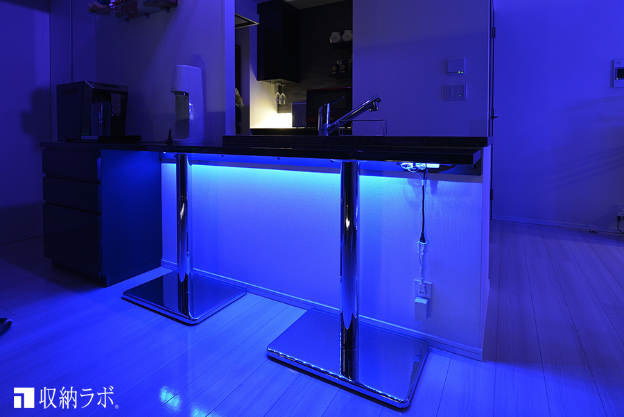 カップボードの背面やカウンター下には照明を取り付け、カウンター下の照明はブルーに照らすこともできます。気分次第でインテリアの演出を楽しむことができます。