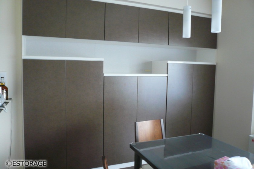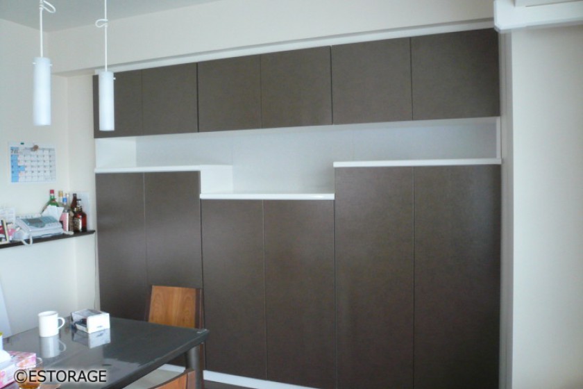 扉はブラウンのレザータイプ、オープン部分の背板は和調、カウンターは白の鏡面材で他にはない1つだけの壁面収納が完成しました。
