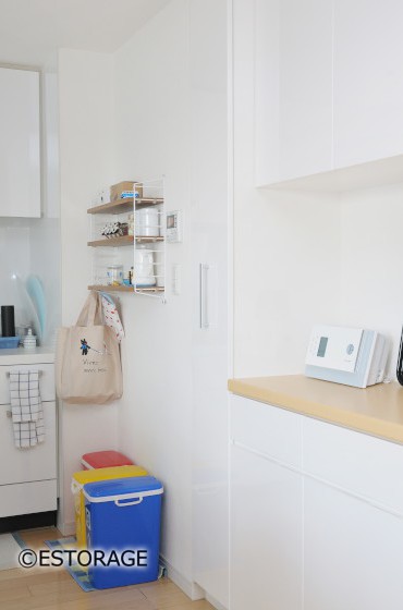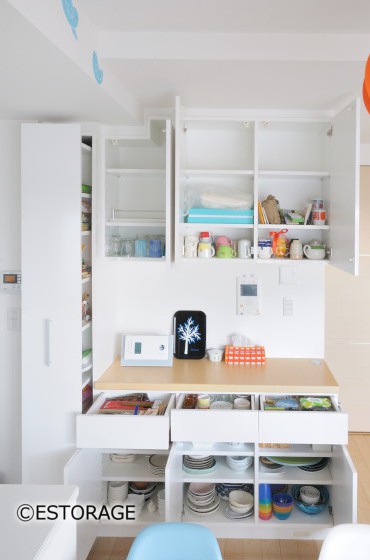壁際の空間に大型の引き出し収納を組み込んだことで、幅が狭く奥行がある、一般的には使いづらくなりがちな空間も非常に使い勝手よく使うことができます。