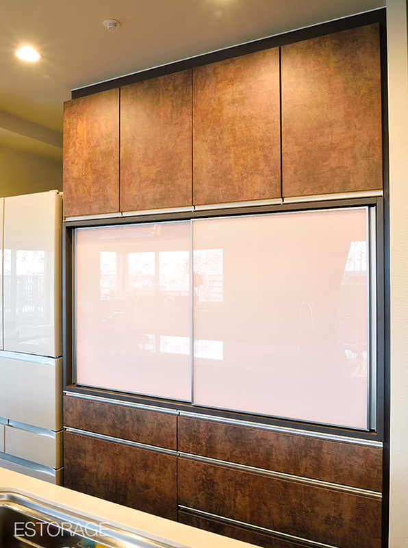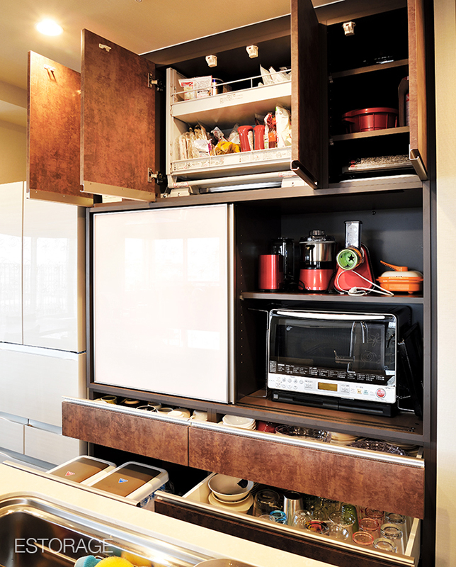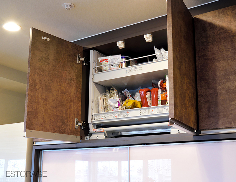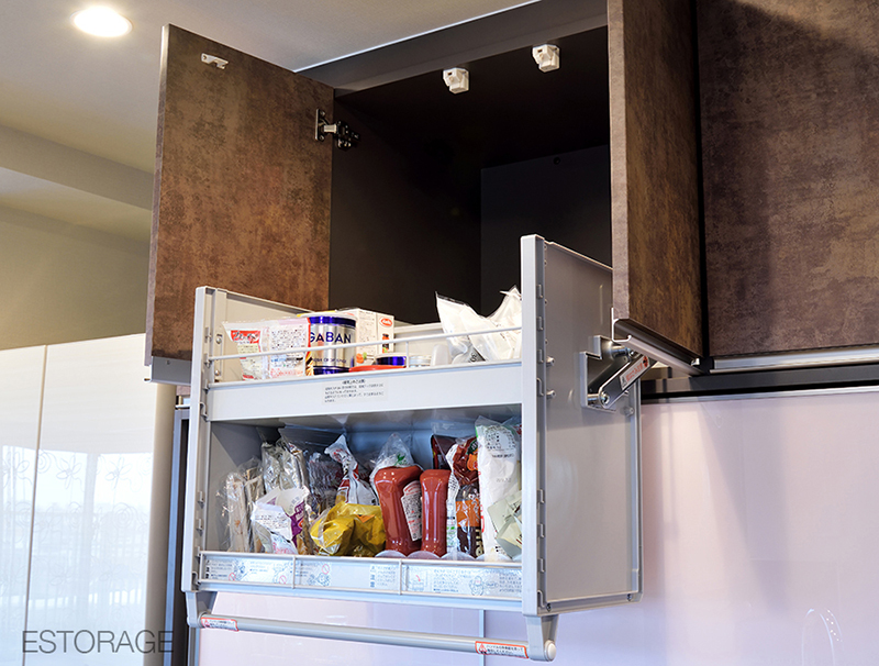 普段あまり使わない食材のストックなどは、上部の収納ボックスに収納していますが、使う時には、収納ボックスの棚ごと下に降ろして使えるので、背伸びをせずに取り出せる構造になっています。