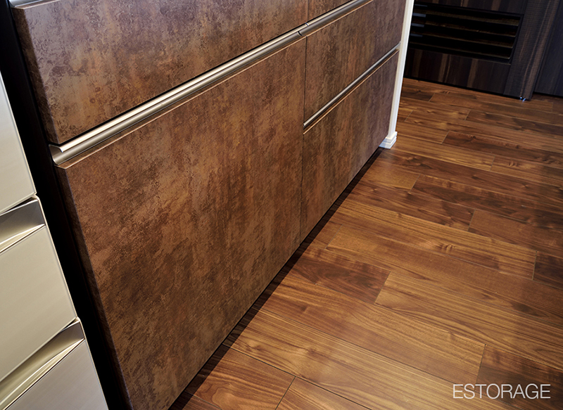 お部屋の壁と床、ダイニングセット、ソファーの雰囲気に合わせて、収納家具の扉と面材には銅板調素材を使用。