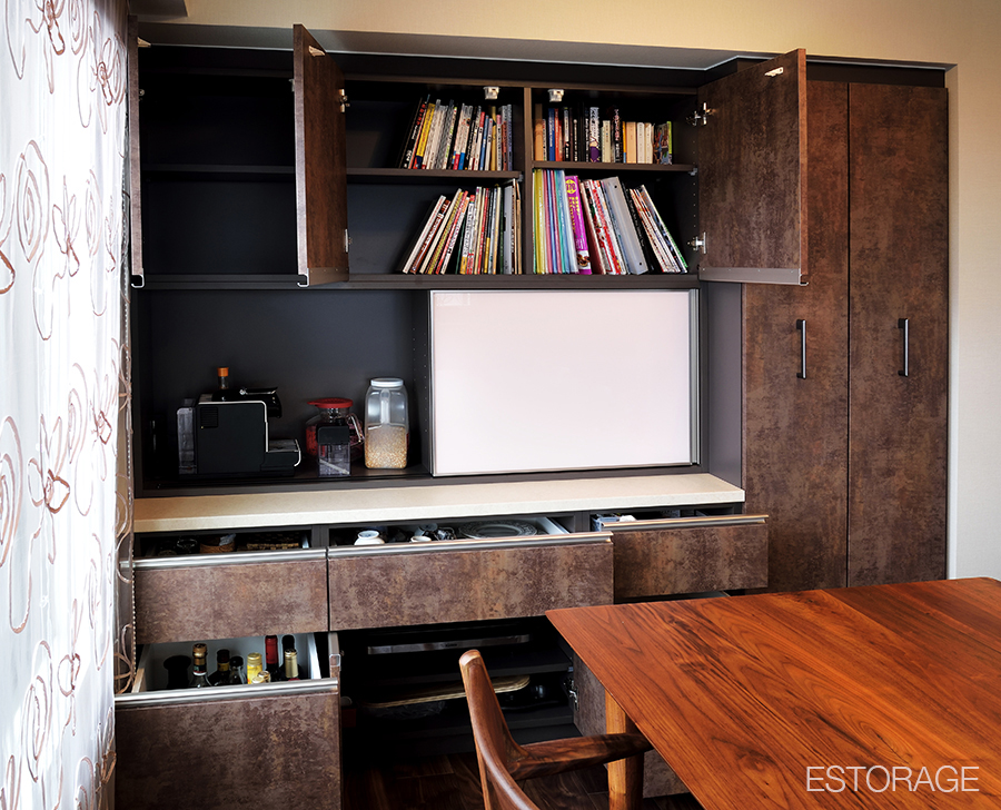 ダイニングの壁面収納にはダイニングで使用する、コーヒーメーカーや本、お酒などを収納。