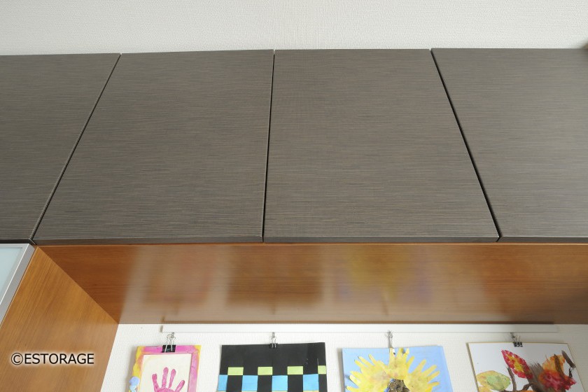 レザー調扉でシックにまとまったカウンター上部収納家具