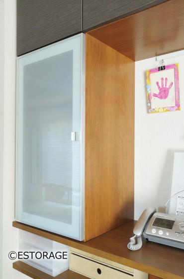 新築時に設置された、電話台の上部をお洒落に収納スペースを増やす事ができました。