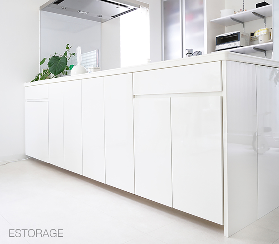 既存のキッチンカウンターは、天板を下から補強するためのパーツがあったのですが、それを取り外し収納家具を設置しました。