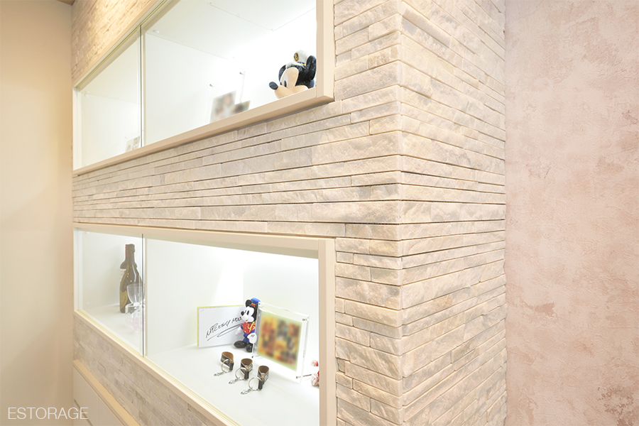 今回、お客様からの「思い出のモノや写真を飾りたい」というご要望を受けて選んだのは、モザイクの石張りによる質感のある白。ほのかな温かみも感じさせつつオブジェの存在感を引き立てています。