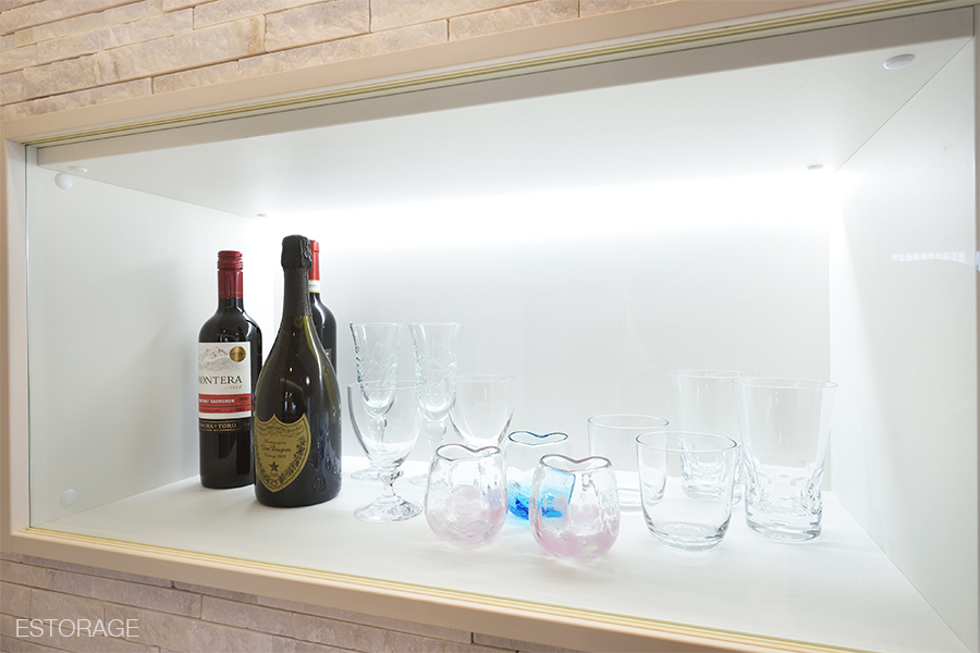 ディスプレイにこだわった壁面収納と機能的な食器棚で、理想の新居を実現。