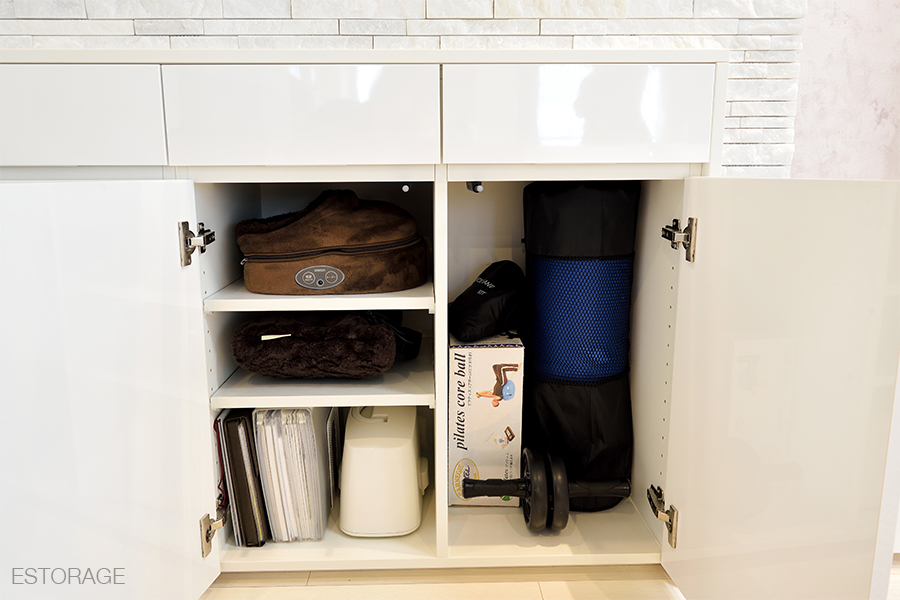 また、飾り棚・テレビ下は、たっぷりモノを入れられる収納スペースとしています。出し入れしやすく、ご主人がお使いになるフィットネスグッズやフィットネスマットの置き場に困ることはなくなりました。