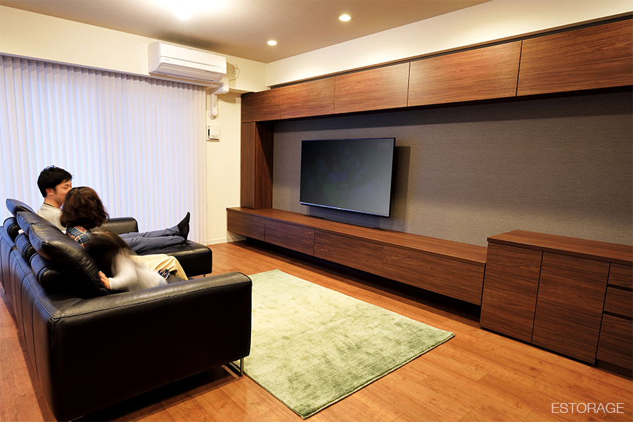 家具もデザインの良さも気に入っていますし、このL型の壁面収納によって部屋全体を取りまく一体感が生まれ、何より、以前と同じ大きさのはずのリビングに広がり感が出たと思います。