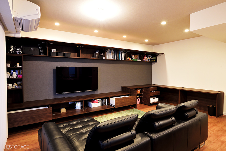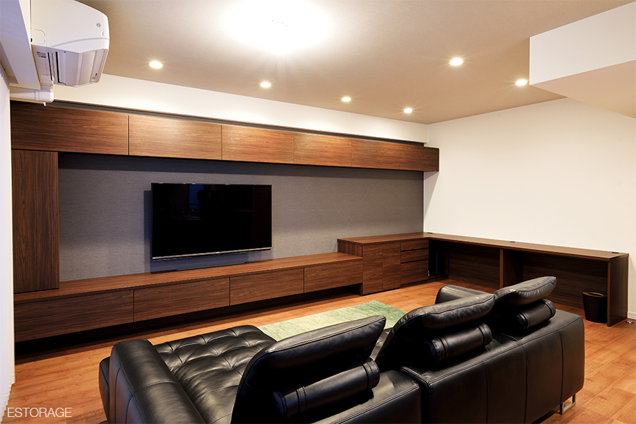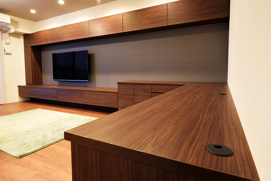 ご家族それぞれに専用スペースを設けたリビング壁面収納