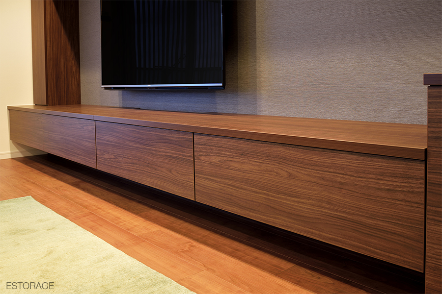 さらに、テレビ下のベースユニット(下の収納ボックス)を床から浮かせたことで、床面の奥行きも出て、フロアが広く感じられるところも気に入っています。