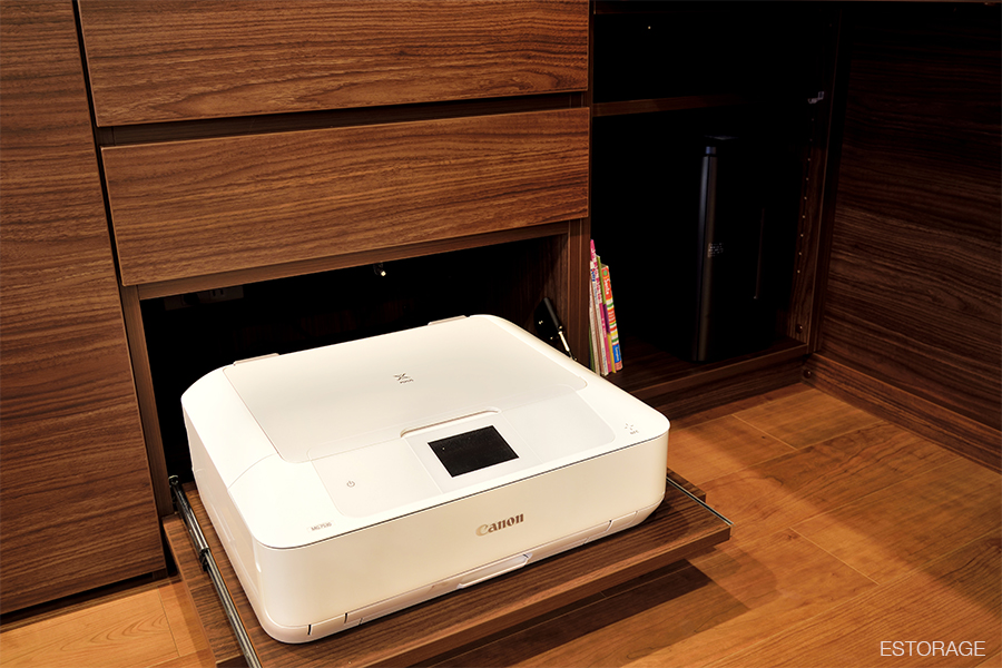 テレビのスペースは、床から収納ボックスを浮かして床面を広く見せていますが、テレビとデスクの間にある収納ボックスには、プリンターなど入れる収納力を確保するために床まで使いました。