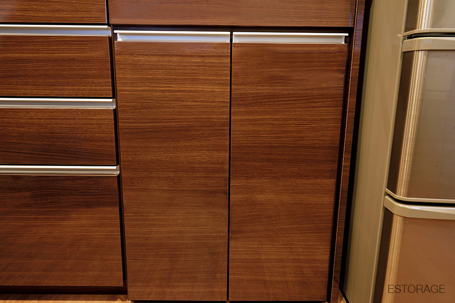 新たに設けるキッチン収納は、マンション付属のキッチンと扉の柄を合わせて統一感を持たせつつ、棚の上部右側は棚の中が、かすかに見える濃いめの黒いガラス扉をセレクト。全体を木目で統一するのではなく、アクセントとして異なる素材を組み合わせる事にしました。