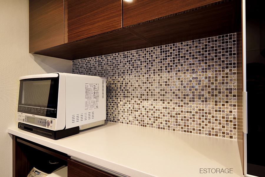 木目とモザイクタイルのブラウンがマッチしたキッチン収納