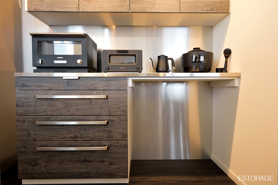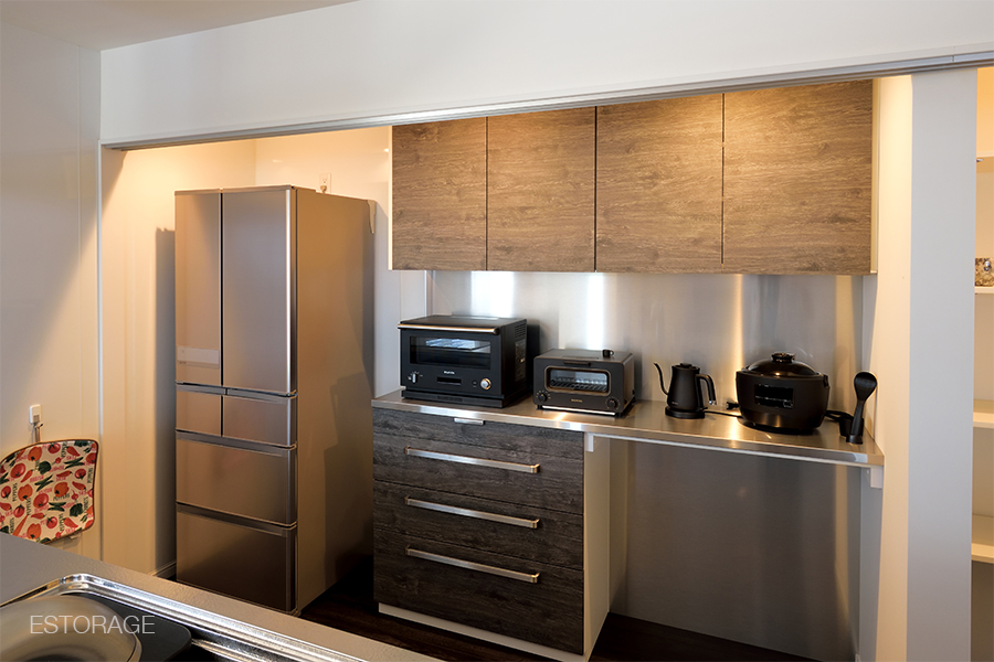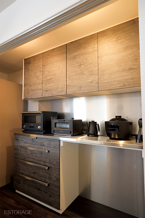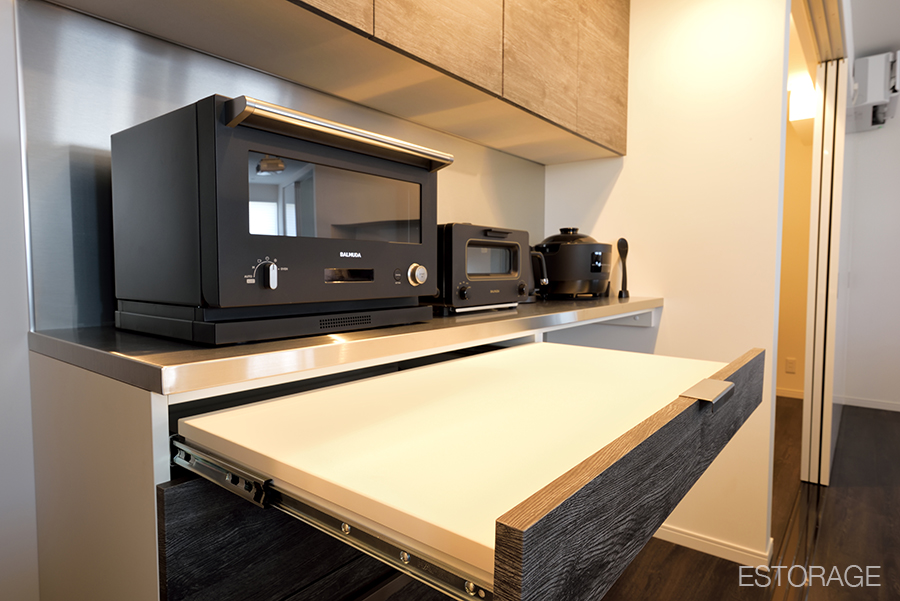 調理家電をのせる天板は、お手入れのしやすさやシステムキッチンとの調和などからステンレスをご提案し、ご採用いただきました。