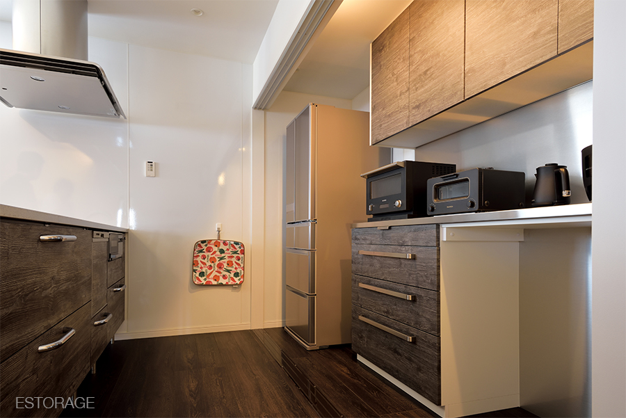 調理家電を置くスペースの上にある収納ボックスの底面には、調理中に出る蒸気を考慮して湿気に強い素材を使ってくれました。家具の耐久性にも配慮するアイデアに感心しました。