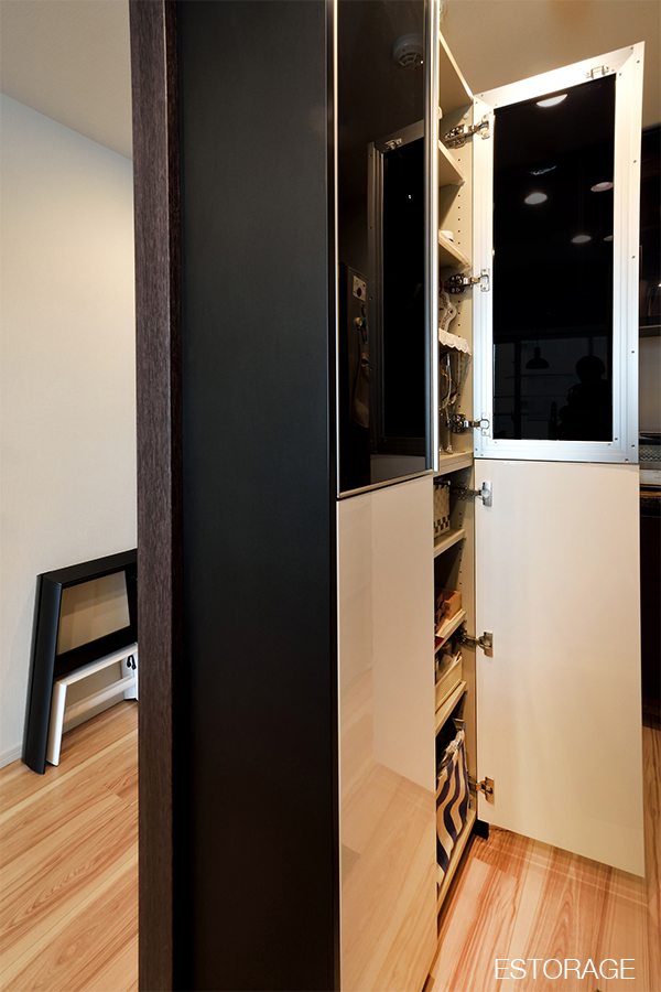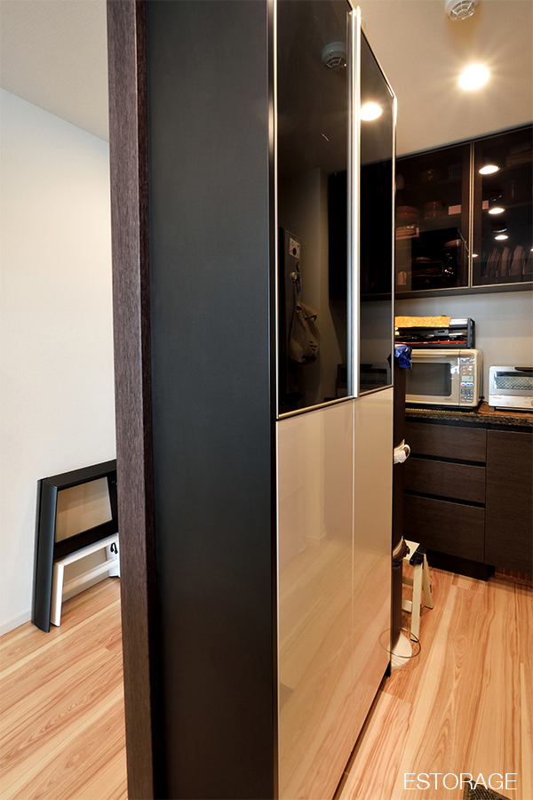 これによってリビング側からは食器棚の側面だけが見えるため、キッチンの印象がスッキリしました。