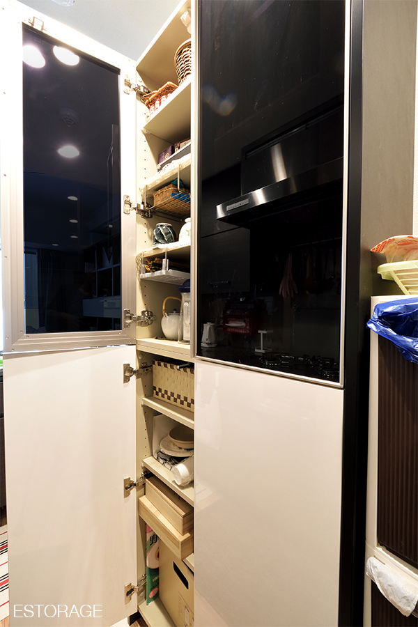 機能重視でプランしてもらったのと、壁に固定した施工のおかげで、以前の食器棚よりずっと使いやすく便利になり、地震でも家具が倒れてこない安心感があります。