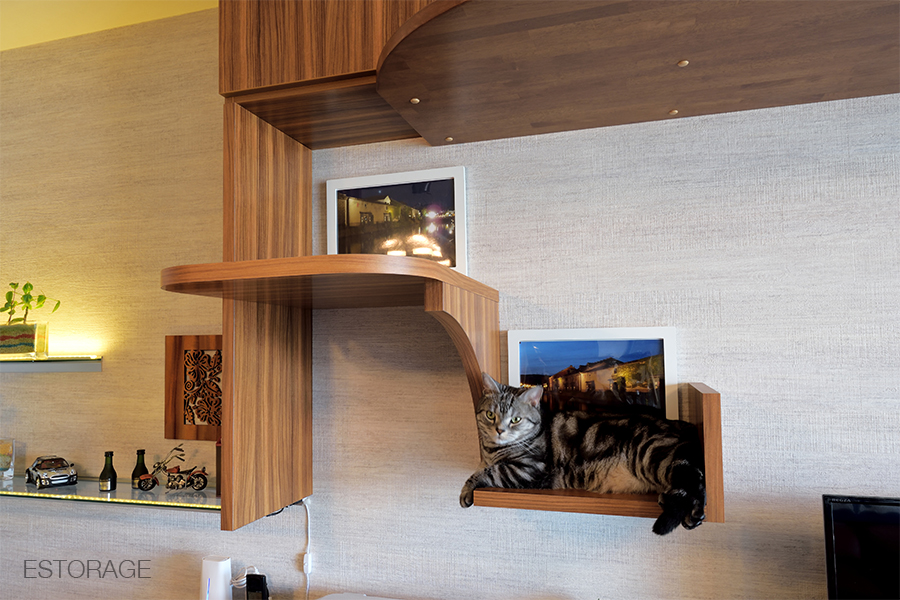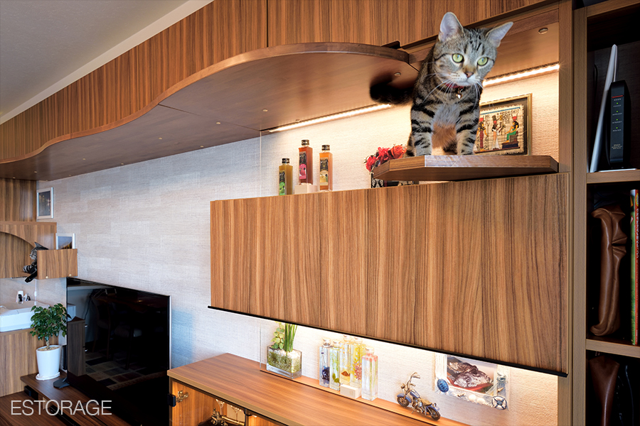 キャットウォーク付きリビング収納で、猫たちとの暮らしが快適に。
