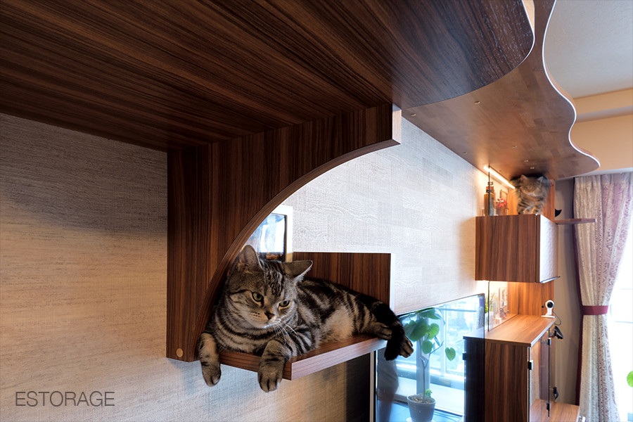 キャットウォークとしての棚板は曲線を活かしたデザイン。猫用のトイレスペースには、遊び心あふれる足跡の切り抜きは、猫たちの出入り口にもなっています。猫たちは、部屋の中で遊べるスペースが生まれて運動不足解消や気分転換ができた様子。二匹の猫たちには、それぞれお気に入りの場所ができて、うたた寝したり、マンションの外を眺めていたりしています。私たちも収納に関するストレスがなくなり、猫たちとの暮らしがさらに楽しくなりました。