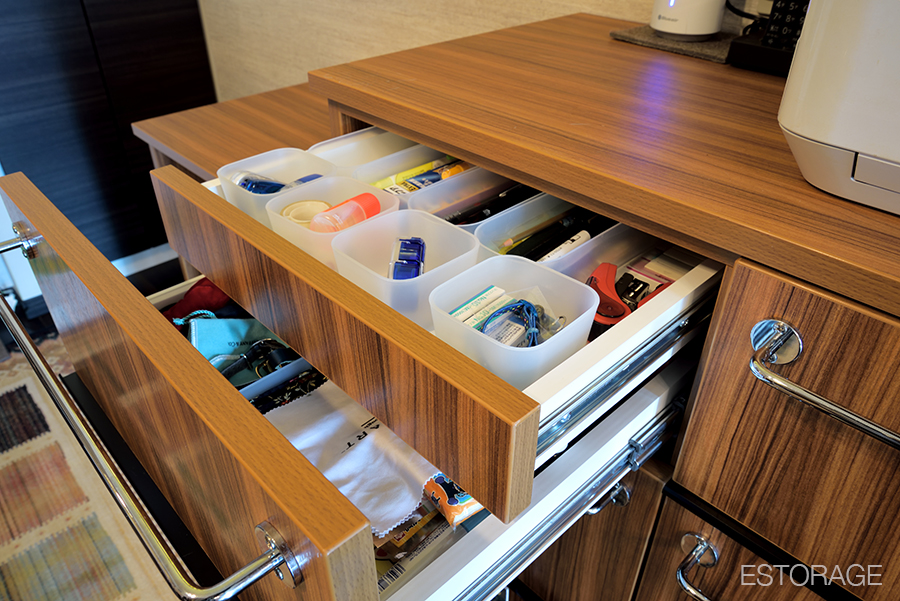 収納ボックスや引き出しは、文房具やファイルケースなど収納する物に合わせて収納スペースのサイズを設計してもらったので、使いやすさはもちろん、それぞれの物が収まる場所が決まりました。