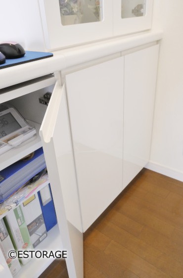 雑誌や書類などは開き扉に収め、一番左には洋服用の引き出しを設置。カウンタータイプでスッキリ納まります。