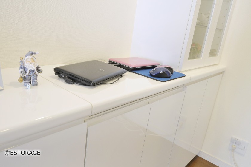一見普通のキャビネットのようですが、カウンターの一部をスライド型でパソコンデスクとしても活躍します。