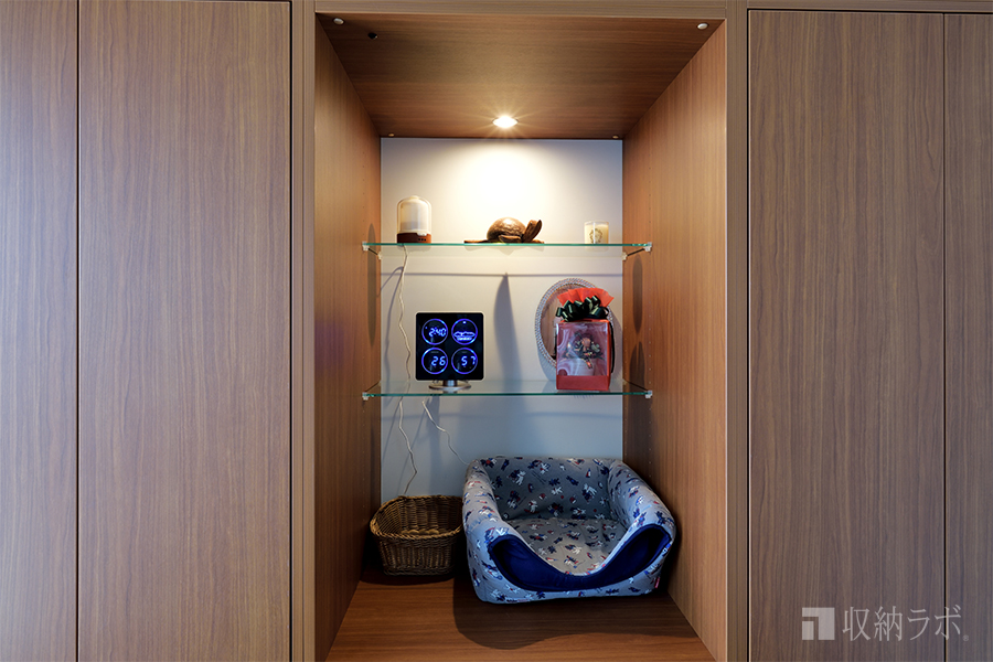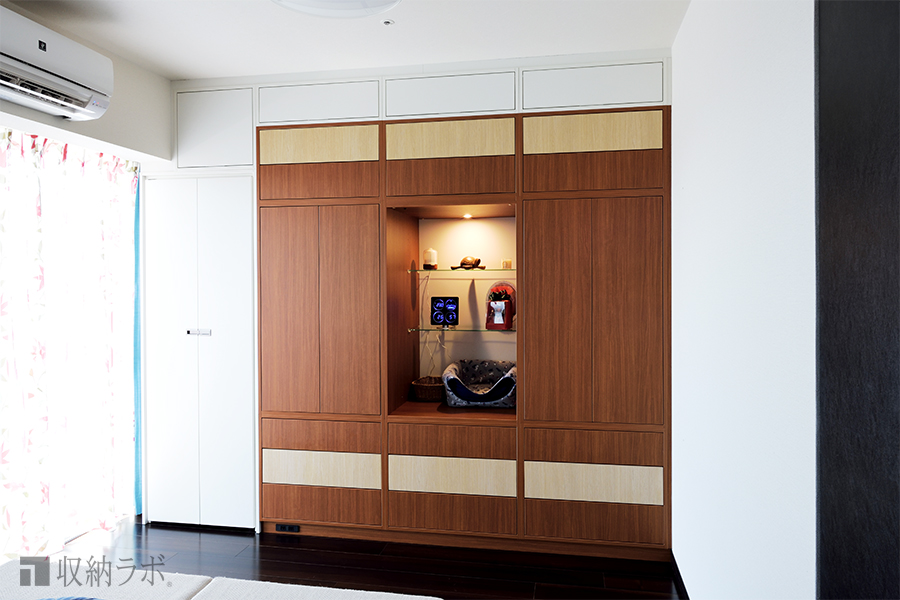 クローゼット収納の中央には猫のベッドを置くスペースを確保しました。猫も一緒に寝室で過ごせるので、猫たちも居心地が良さそにしています。この中央部分は飾り棚としても使えるようにしてもらったので、寝室にもディスプレイを楽しめるスペースが出来たので、部屋の雰囲気も良くなって嬉しいです。