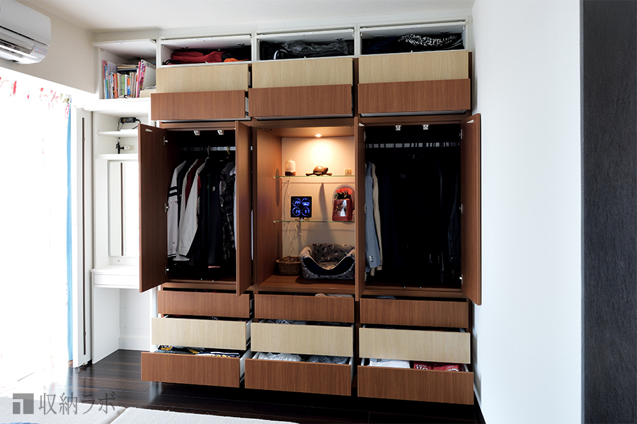 色違いの木目調の引き出しは、すべて同サイズで作ったので入れ替え可能。夏物・冬物の衣替えは引き出しごと上段と下段の入れ替えるだけで簡単にできるようにしました。