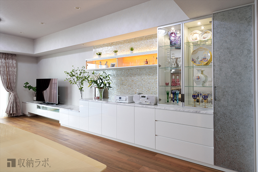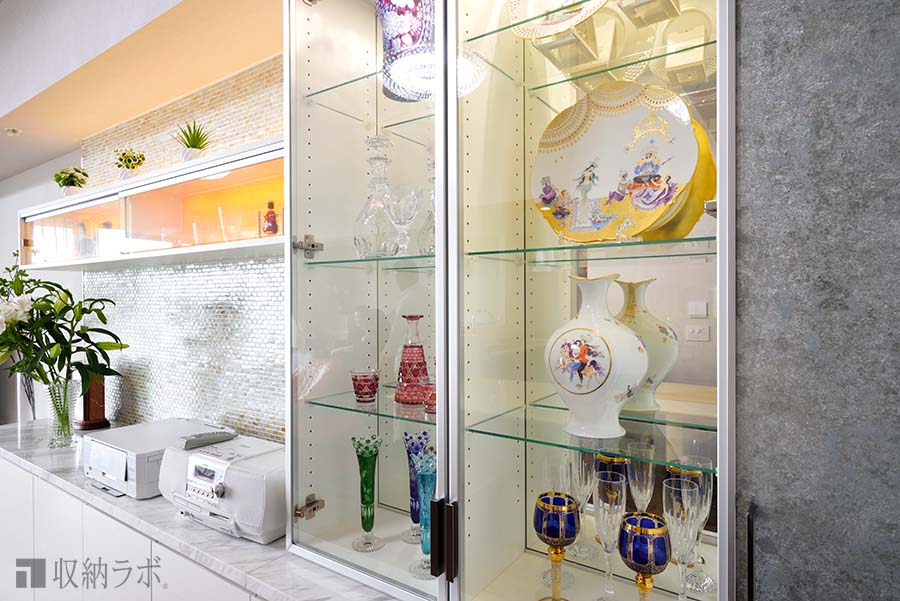 その他にも、背面にはガラス素材のタイルを使ったたり、右隅の収納スペースの扉にはガラスと銀箔を使った面材を使ったり、様々な素材を見つけてきて頂いたので、オーダーメイドならではの素材感のリビング収納になりました。ガラス扉の飾り棚にはガラスや陶器のコレクションを飾ったり…と、あれこれ楽しんでいます。