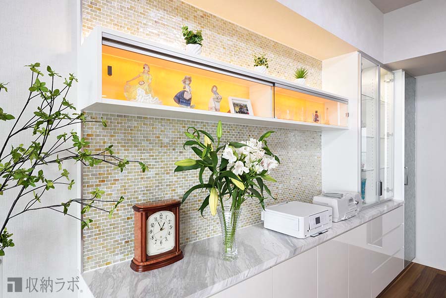 飾り棚の背面には、オニキスという石材を提案してもらいました。珍しい素材でリビング収納のデザインも引き立つ素材だったので採用しました。完成した飾り棚に照明を灯すと淡いオレンジに光って見え、リビング収納のアクセントにもなりとても気に入っています。
